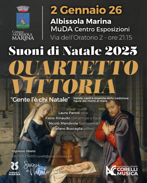 Protagonista della serata sarà il Quartetto Vittoria con lo spettacolo “Gente l’è chi Natale”, un viaggio musicale attraverso le tradizioni natalizie liguri, dai monti al mare. Il programma include canti popolari, pastorali e brani strumentali come valzer, mazurche e monferrine, radicati nella cultura dell’Appennino.