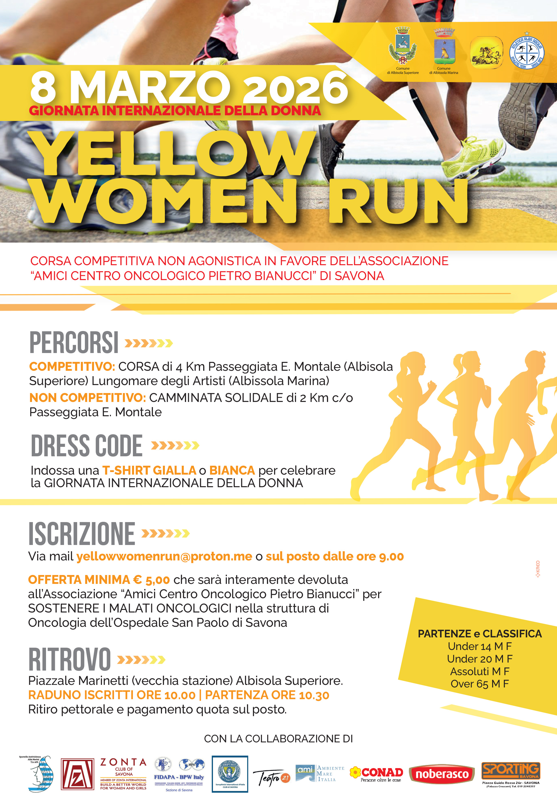 Dopo il grande successo del 2025, torna una nuova edizione di Yellow Women Run la corsa e camminata solidale tra le due Albisole in occasione della "Giornata Internazionale della Donna" DOMENICA 8 MARZO 2026.