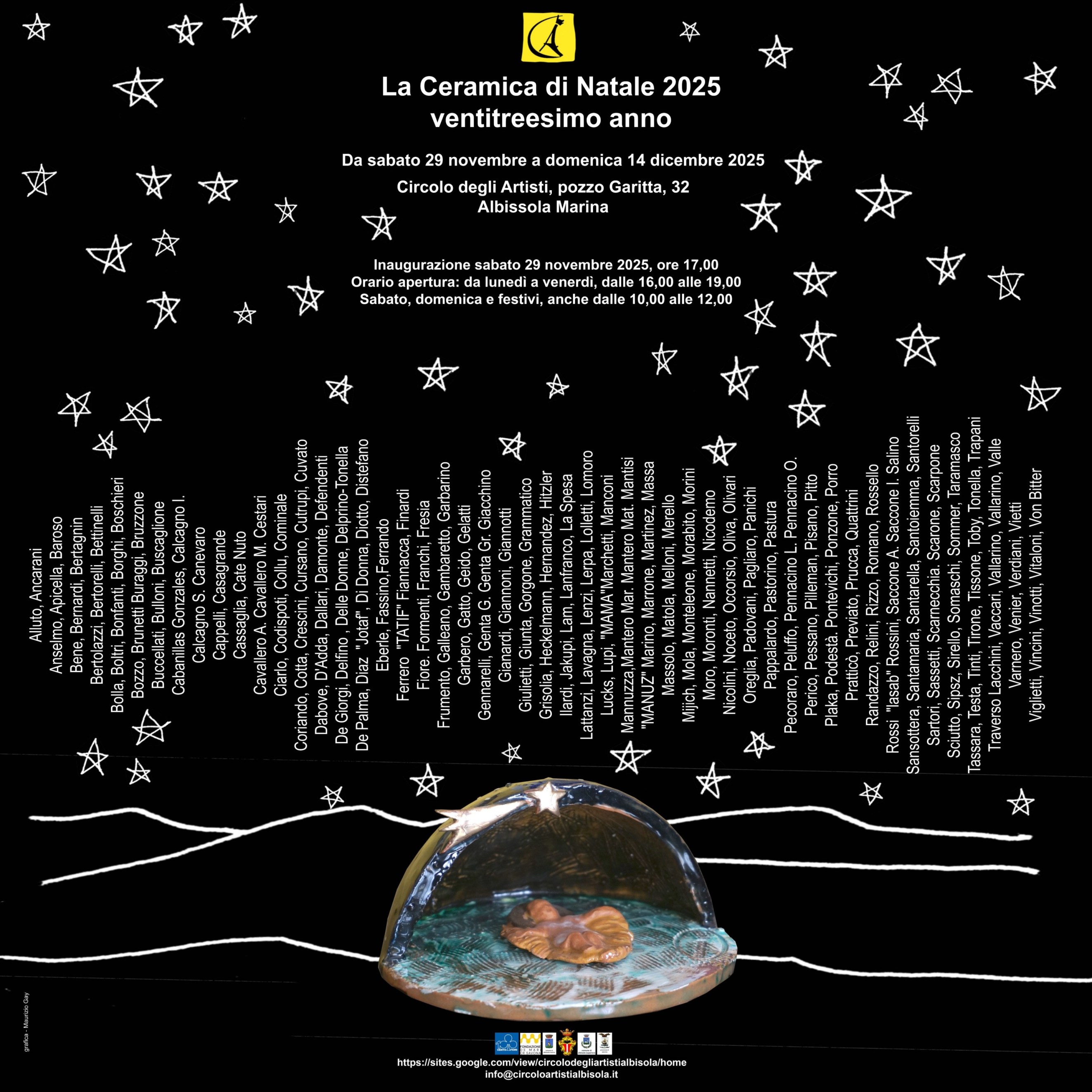 Sabato 29 novembre 2025, alle ore 17, presso la nostra sede di Pozzo Garitta, 32 di Albissola Marina, si inaugurerà la ventitreesima edizione della rassegna "La Ceramica di Natale" che si protrarrà fino a domenica 14 dicembre.